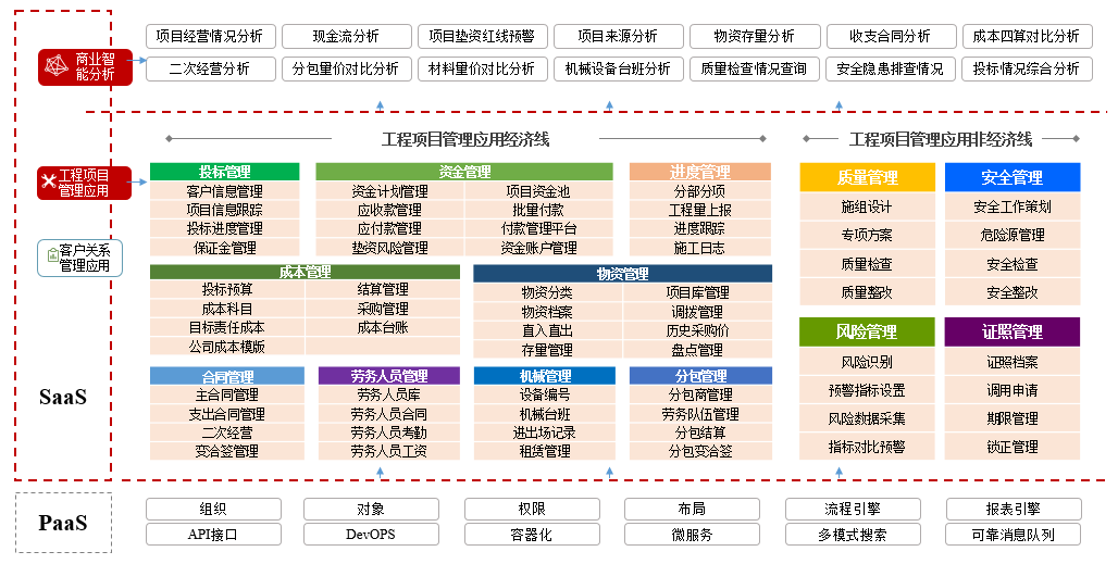 在工程項(xiàng)目管理領(lǐng)域,紅圈在 PaaS 平臺(tái)基礎(chǔ)上深入結(jié)合建筑工程企業(yè)的業(yè)務(wù)場(chǎng)景,針對(duì)其現(xiàn)金流管理薄弱、成本不可控、項(xiàng)目進(jìn)度滯后、質(zhì)量問(wèn)題頻發(fā)和安全風(fēng)險(xiǎn)較多等痛點(diǎn),通過(guò)資金管理、成本管理、物資管理、安全質(zhì)量管理、投標(biāo)管理、勞務(wù)管理、證照管理等功能模塊,使執(zhí)行人員業(yè)務(wù)流程標(biāo)準(zhǔn)化、透明化。