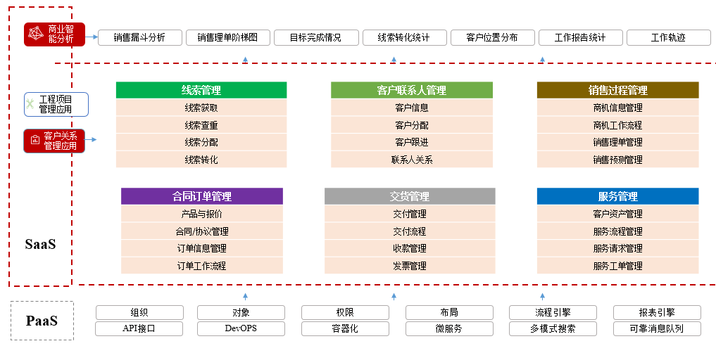 紅圈 CRM+是一款集合了工程項(xiàng)目管理功能和客戶關(guān)系管理功能的 SaaS 產(chǎn)品,以自有底層 PaaS 平臺(tái)為依托,以業(yè)務(wù)實(shí)踐經(jīng)驗(yàn)為指導(dǎo)而構(gòu)建。產(chǎn)品以助力企業(yè)級(jí)客戶提效率、降風(fēng)險(xiǎn)、控成本、管過(guò)程、增利潤(rùn)為核心價(jià)值,能夠?qū)崿F(xiàn)在工程項(xiàng)目管理和客戶關(guān)系管理領(lǐng)域不同功能模塊的靈活配置,滿足客戶的個(gè)性化需求。