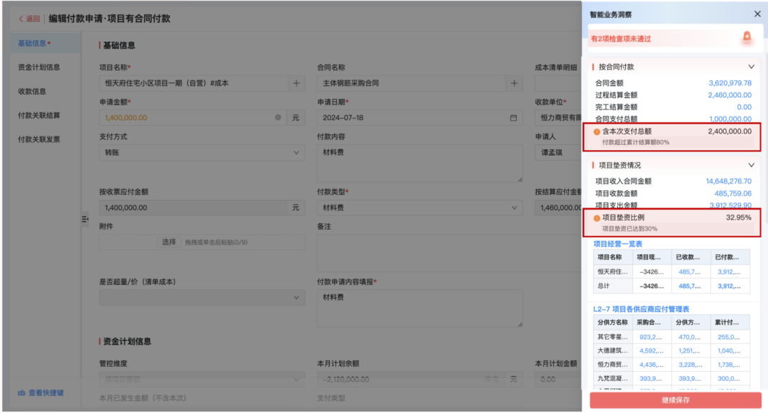 通過(guò)系統(tǒng)實(shí)時(shí)看得到公司資金情況,明確知道哪些項(xiàng)目能有資金去做去投資、哪些資金要計(jì)劃對(duì)外結(jié)算支付,項(xiàng)目現(xiàn)在開(kāi)了多少票、還有多少錢沒(méi)有回,同時(shí)也能對(duì)進(jìn)度款、質(zhì)保金、投標(biāo)保證金等回款設(shè)置提醒,防止逾期未回。項(xiàng)目墊資情況也能同步關(guān)注,判斷公司的經(jīng)營(yíng)狀況是否穩(wěn)健。