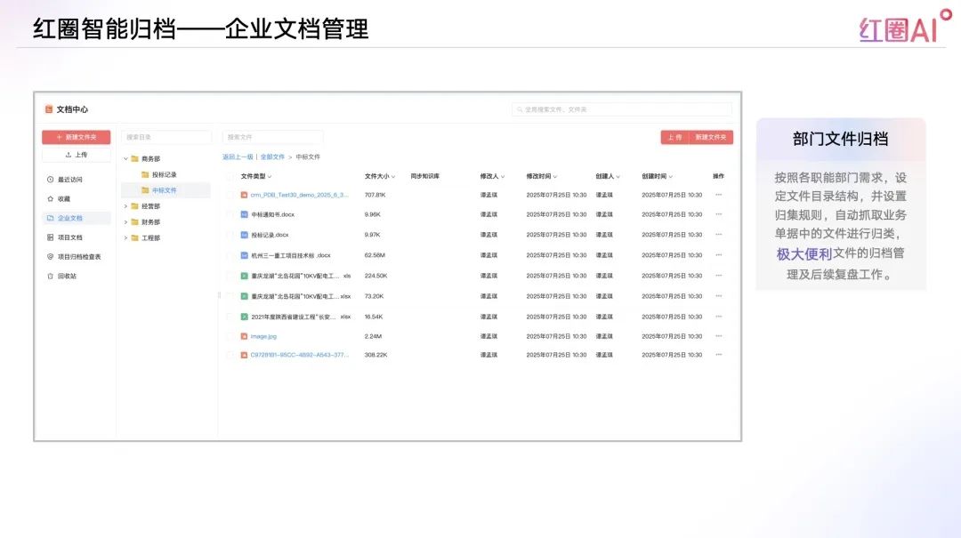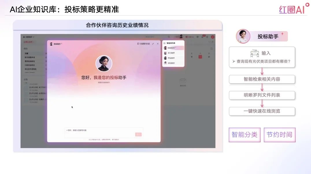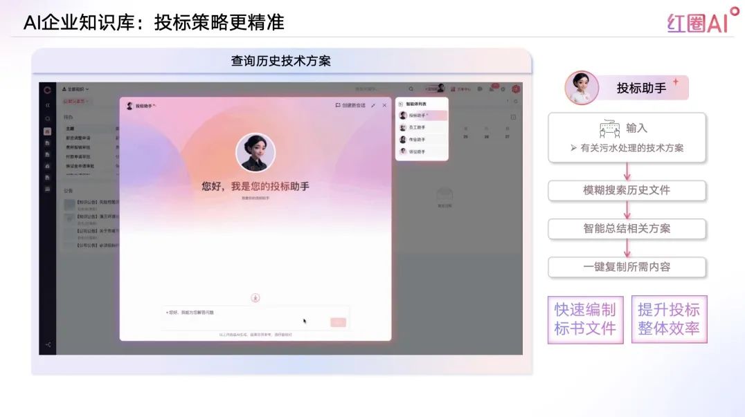 以往投標流程中,資料查找和內(nèi)容比對耗時耗力、風險頻發(fā)。紅圈AI通過快速檢索歷史標書、技術(shù)方案、成功案例等內(nèi)容,助力企業(yè)建立專屬“投標智庫”,讓策略制定更具數(shù)據(jù)支撐。