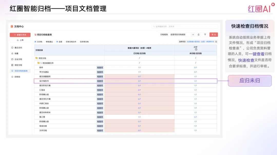 系統(tǒng)自動按照業(yè)務(wù)單據(jù)上傳文件情況,形成“項目歸檔檢查表”,公司負責資料管理的人員,可一鍵查看歸檔情況,包括“應(yīng)歸未歸”、“應(yīng)歸已歸”、“已歸未審核通過”等。