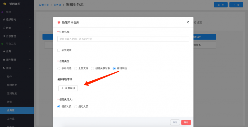 - 業(yè)務(wù)流添加階段任務(wù),新增“編輯字段”類(lèi)型任務(wù),所有設(shè)置的字段均為必填