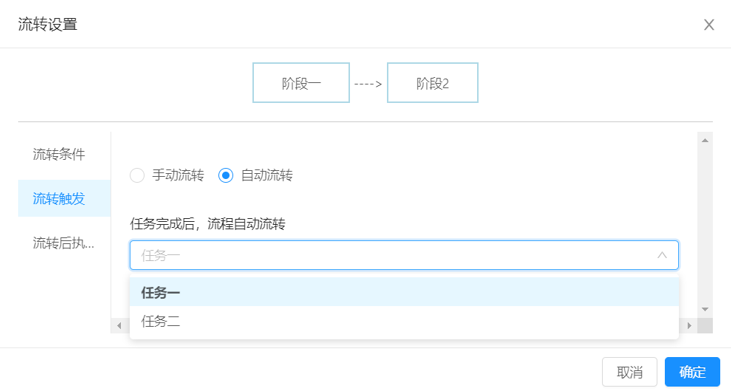 業務流流轉設置中,流轉觸發中增加 自動流轉,可以用當前階段的某個任務作為觸發動作;