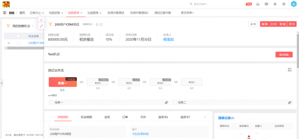 業務流階段上顯示階段預計時長及實際時長,實際時長在階段流轉出后自動計算停留天數