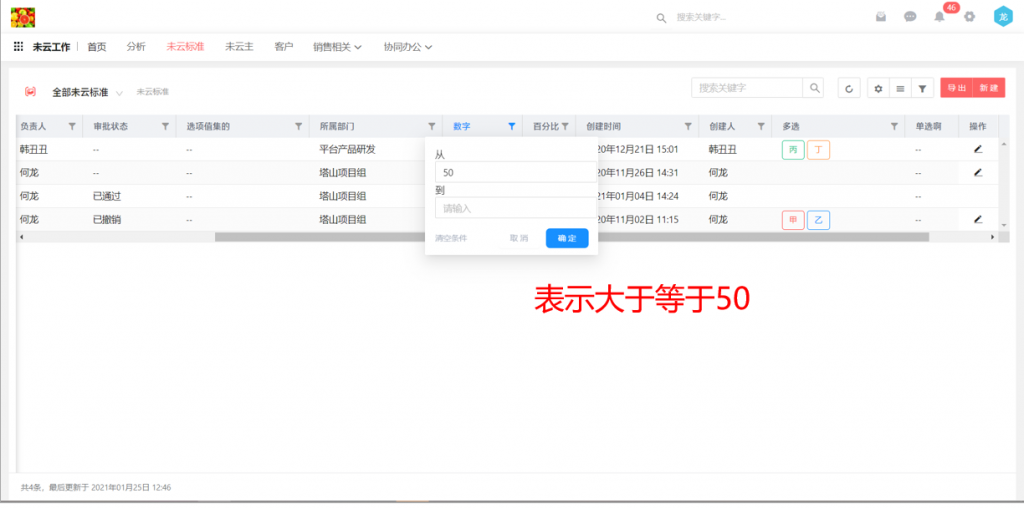 7)數據列表中,數值型字段在表頭篩選時可以只輸入一邊,或者兩邊輸入相同數值,進行篩選