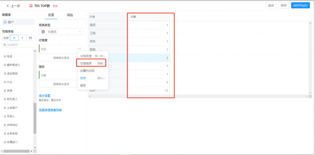 2)選項值集的單選字段,在作為維度時,可以分層級統計,類似部門;比如選擇一級進行查看,每行維度會匯總當前一級選項以及所有下級選項的數據