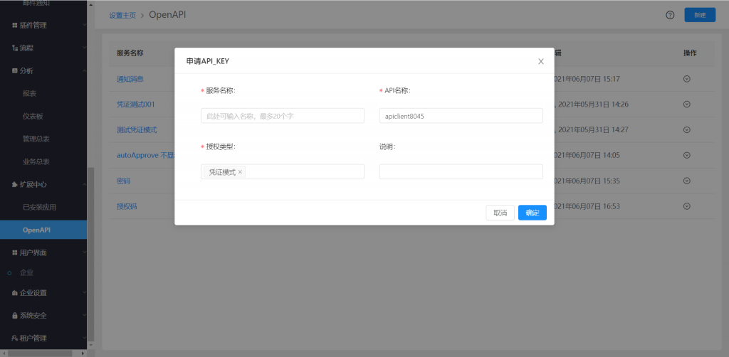 OpenAPI在功能開通后,用戶可以在后臺自行創建連接,生成密鑰