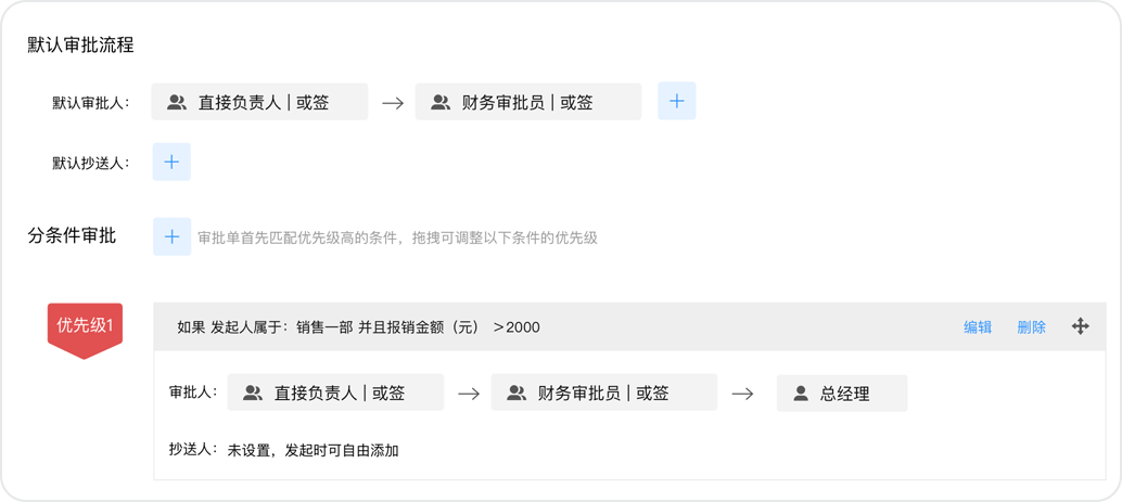 小王這次要報(bào)銷2500元的出差費(fèi)用,而公司規(guī)定報(bào)銷超出2000元就需要總經(jīng)理進(jìn)行額外審批。這種情況可以通過設(shè)置“分條件審批”功能來實(shí)現(xiàn),將報(bào)銷金額是否大于2000作為判斷應(yīng)該走哪一條流程的條件:1)金額小于等于2000元時,流程按“直接負(fù)責(zé)人-財(cái)務(wù)審核員”執(zhí)行;2)金額大于2000元時,流程按“直接負(fù)責(zé)人-財(cái)務(wù)審核員-總經(jīng)理”執(zhí)行。分條件審批不僅可以設(shè)置按金額判斷,還可以設(shè)置按發(fā)起人部門、報(bào)銷類型等判斷。