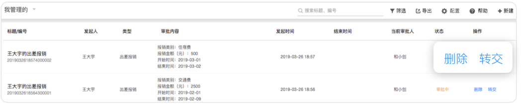 小王平時不僅會提交“出差報(bào)銷”這種辦公類審批,還會提交“合同審核”這種經(jīng)營類審批。公司希望每類審批都由專人來管理模板與數(shù)據(jù),防止敏感數(shù)據(jù)內(nèi)部泄露。這時公司可以為每個審批設(shè)置“模板管理員”,由該審批生成的全部數(shù)據(jù)將只能由這個模板管理員維護(hù)并導(dǎo)出。同時他也可以將審批中的流程轉(zhuǎn)交給其他人,以避免出現(xiàn)審批人休假或離職后流程卡住的情況。模板管理員還可以協(xié)助企業(yè)管理員來編輯審批模板,有效分擔(dān)工作。