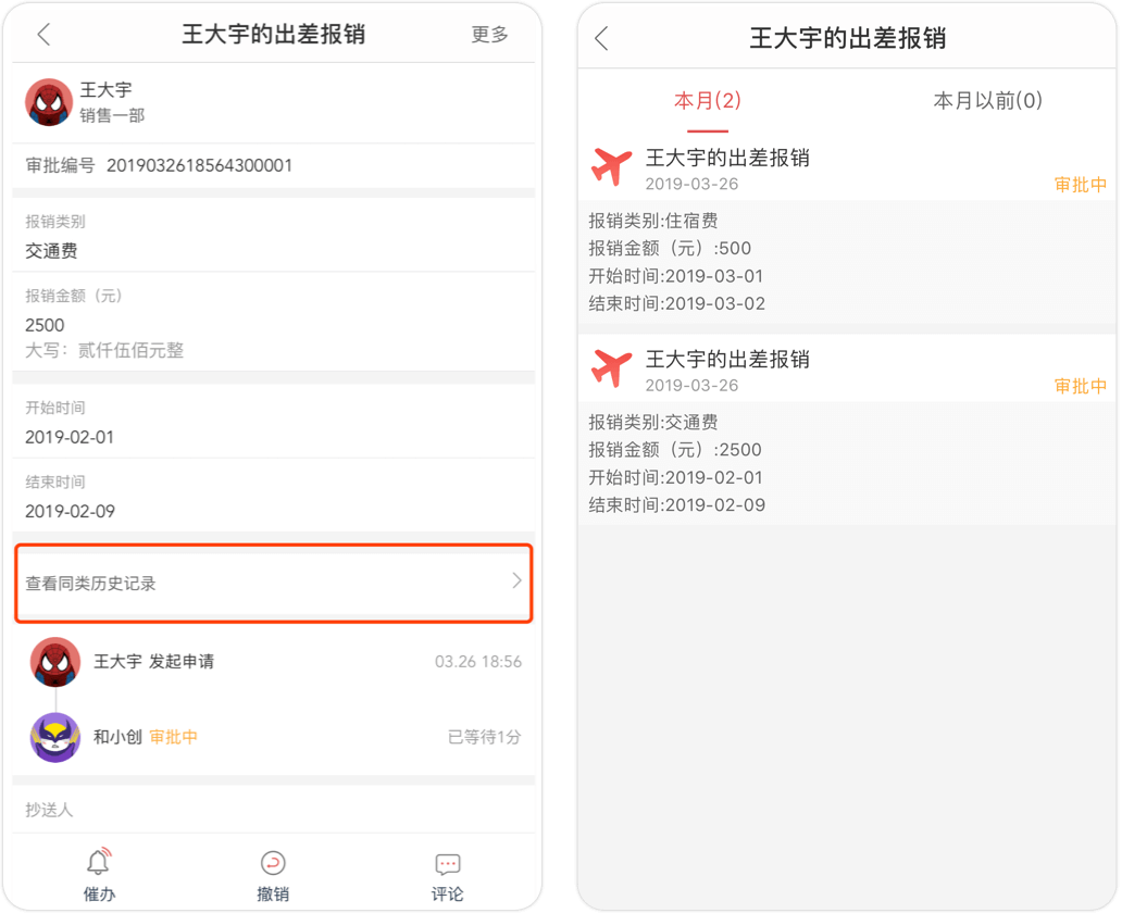 審批人可以查看發(fā)起人同類審批的歷史情況。比如報(bào)銷審批時,可以看該員工本月或之前已經(jīng)發(fā)起了幾次報(bào)銷申請。