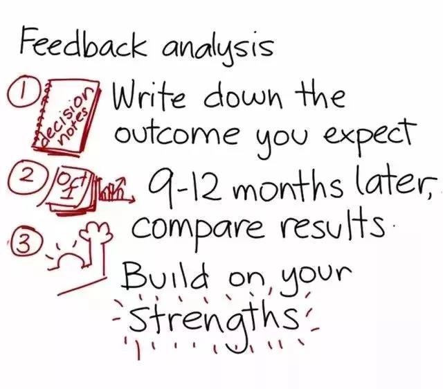 要發(fā)現(xiàn)自己的長(zhǎng)處,唯一途徑就是回饋分析法(feedback analysis)。每當(dāng)做出重要決定或采取重要行動(dòng)時(shí),你都可以事先記錄下自己對(duì)結(jié)果的預(yù)期。9 到 12 個(gè)月后,再將實(shí)際結(jié)果與自己的預(yù)期比較。