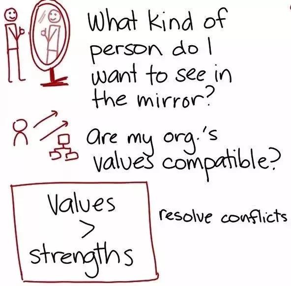 一個(gè)人的工作方式和他的長(zhǎng)處很少發(fā)生沖突,相反,兩者能產(chǎn)生互補(bǔ)。但是,一個(gè)人的價(jià)值觀有時(shí)會(huì)與他的長(zhǎng)處發(fā)生沖突。