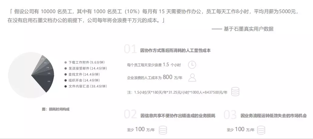 集腋成裘,員工每天花費(fèi)在傳輸文件、查找文件、內(nèi)容匯總、文件傳輸上的時間并不是個小數(shù)目。對于一家10000 人規(guī)模的企業(yè)來說,每天至少要耗費(fèi) 90 分鐘的無效時間,這直接導(dǎo)致企業(yè)每年需要付出將近 800 萬元的無效成本。