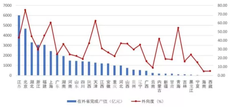 圖4 2021年上半年各地區(qū)跨省完成的建筑業(yè)總產(chǎn)值及外向度