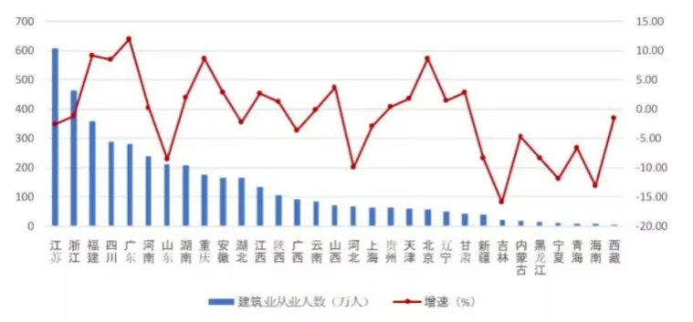 圖5 2021年上半年各地區(qū)建筑業(yè)從業(yè)人數(shù)及其增長(zhǎng)情況