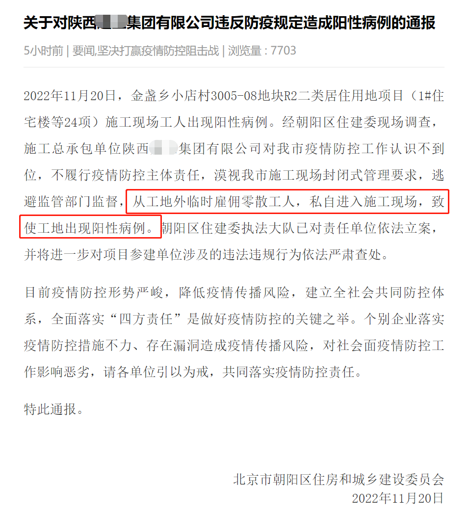 日前,北京市朝陽區(qū)住建委發(fā)布了關于《關于對陜西XX集團有限公司違反防疫規(guī)定造成陽性病例的通報》。