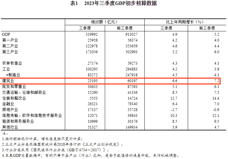 10月18日,國家統(tǒng)計(jì)局發(fā)布2023年三季度國民經(jīng)濟(jì)相關(guān)數(shù)據(jù)。初步核算,前三季度國內(nèi)生產(chǎn)總值913027億元,按不變價(jià)格計(jì)算,同比增長5.2%。建筑業(yè)第三季度總產(chǎn)值23193億元,前三季度60197億元。