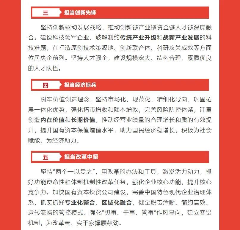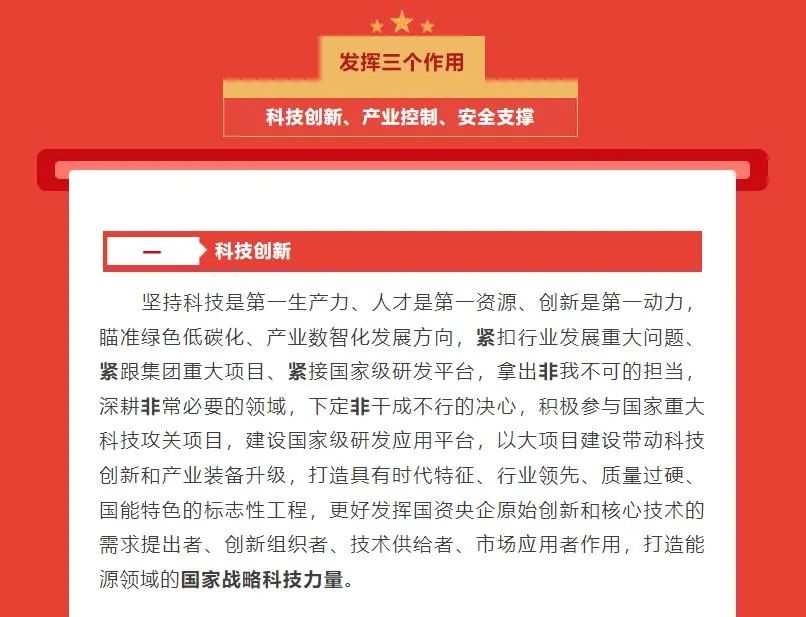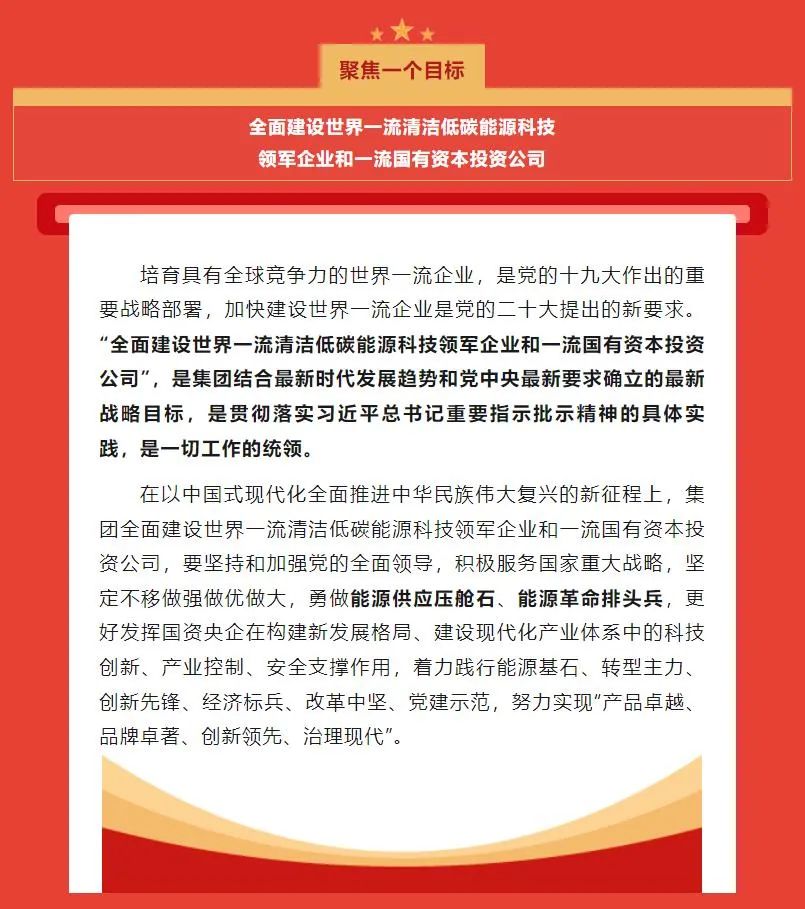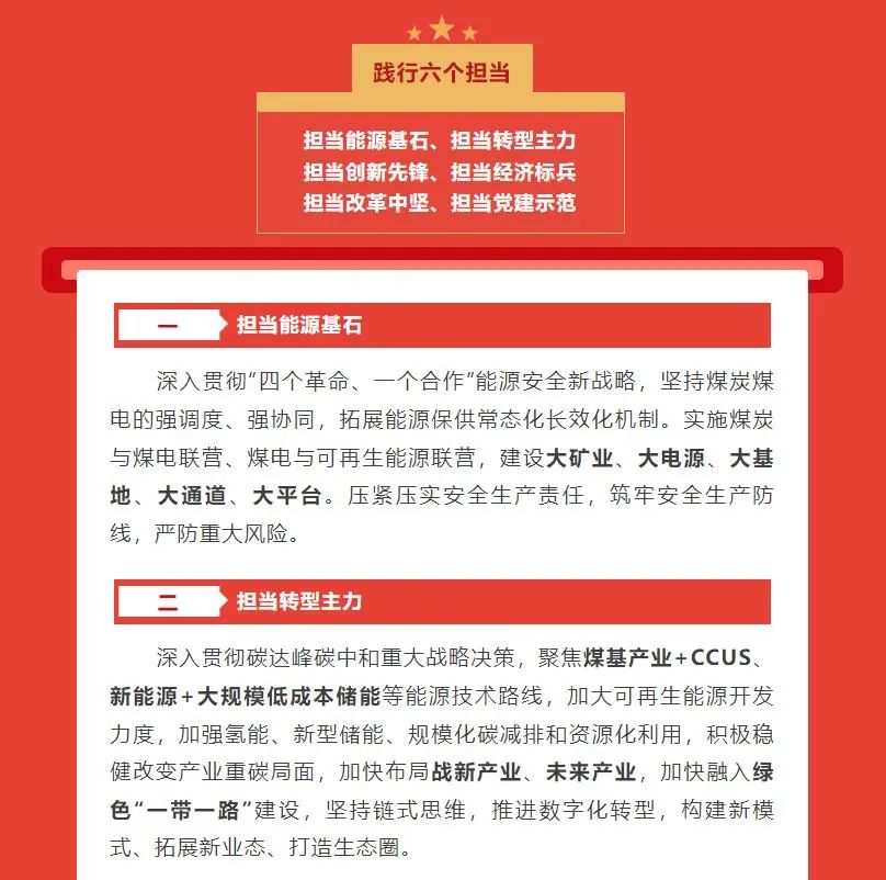 國家能源集團最新確立了“一個目標、三個作用、六個擔(dān)當(dāng)”發(fā)展戰(zhàn)略。一個目標是指“全面建設(shè)世界一流清潔低碳能源科技領(lǐng)軍企業(yè)和一流國有資本投資公司”,三個作用是指發(fā)揮科技創(chuàng)新、產(chǎn)業(yè)控制、安全支撐作用,六個擔(dān)當(dāng)是指擔(dān)當(dāng)能源基石、擔(dān)當(dāng)轉(zhuǎn)型主力、擔(dān)當(dāng)創(chuàng)新先鋒、擔(dān)當(dāng)經(jīng)濟標兵、擔(dān)當(dāng)改革中堅、擔(dān)當(dāng)黨建示范。