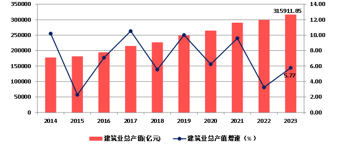 2014年以來,隨著我國建筑業企業生產和經營規模的不斷擴大,建筑業總產值持續增長,2023年達到315911.85億元,比上年增長5.77%。增速較上年提高2.52個百分點(圖3)。