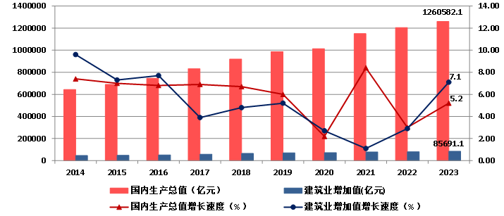 圖1  2014-2023年國內生產總值、建筑業增加值及增速
