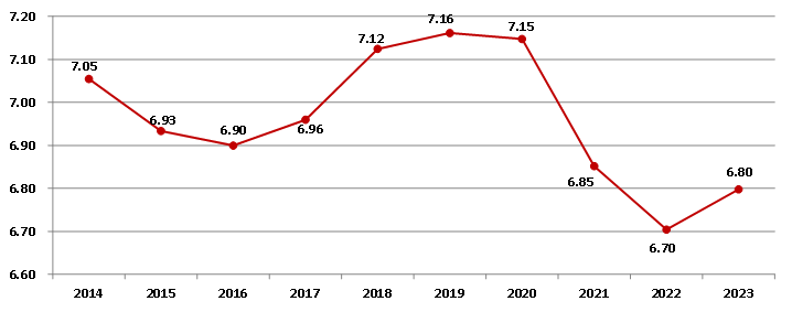 圖2  2014-2023年建筑業增加值占國內生產總值比重