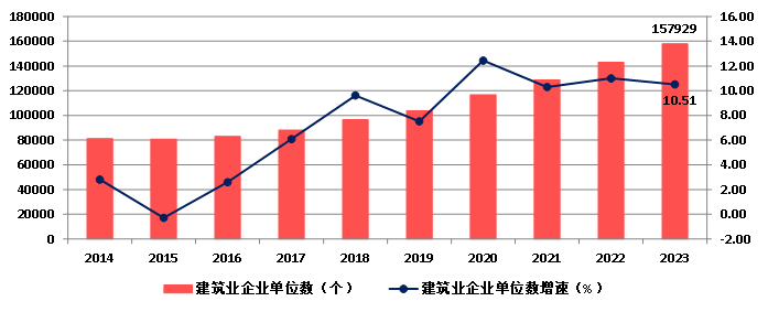 截至2023年底,全國共有建筑業企業157929個,比上年增加15023個,增長10.51%(圖7)。國有及國有控股建筑業企業10060個,占建筑業企業總數的6.37%。
