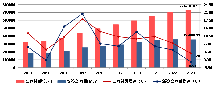 圖10 2014-2023年全國建筑業企業簽訂合同總額、新簽合同額及增速