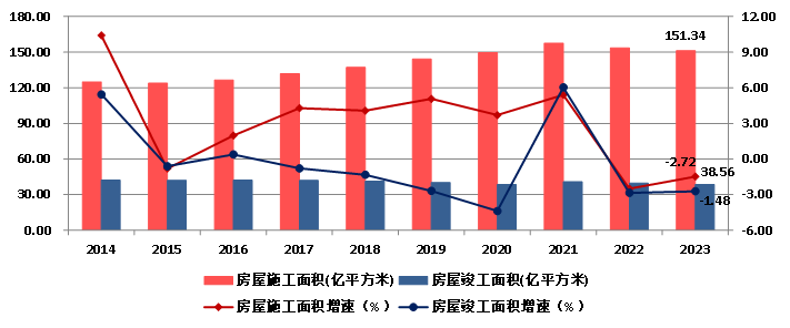 2023年,全國建筑業企業房屋建筑施工面積151.34億平方米,比上年減少1.48%。房屋建筑竣工面積38.56億平方米,比上年減少2.72%(圖12)。