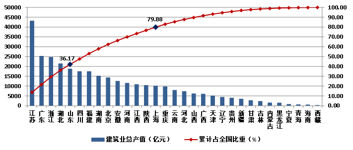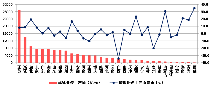 (一)江蘇建筑業總產值以絕對優勢領跑全國  藏、遼、新增速較快